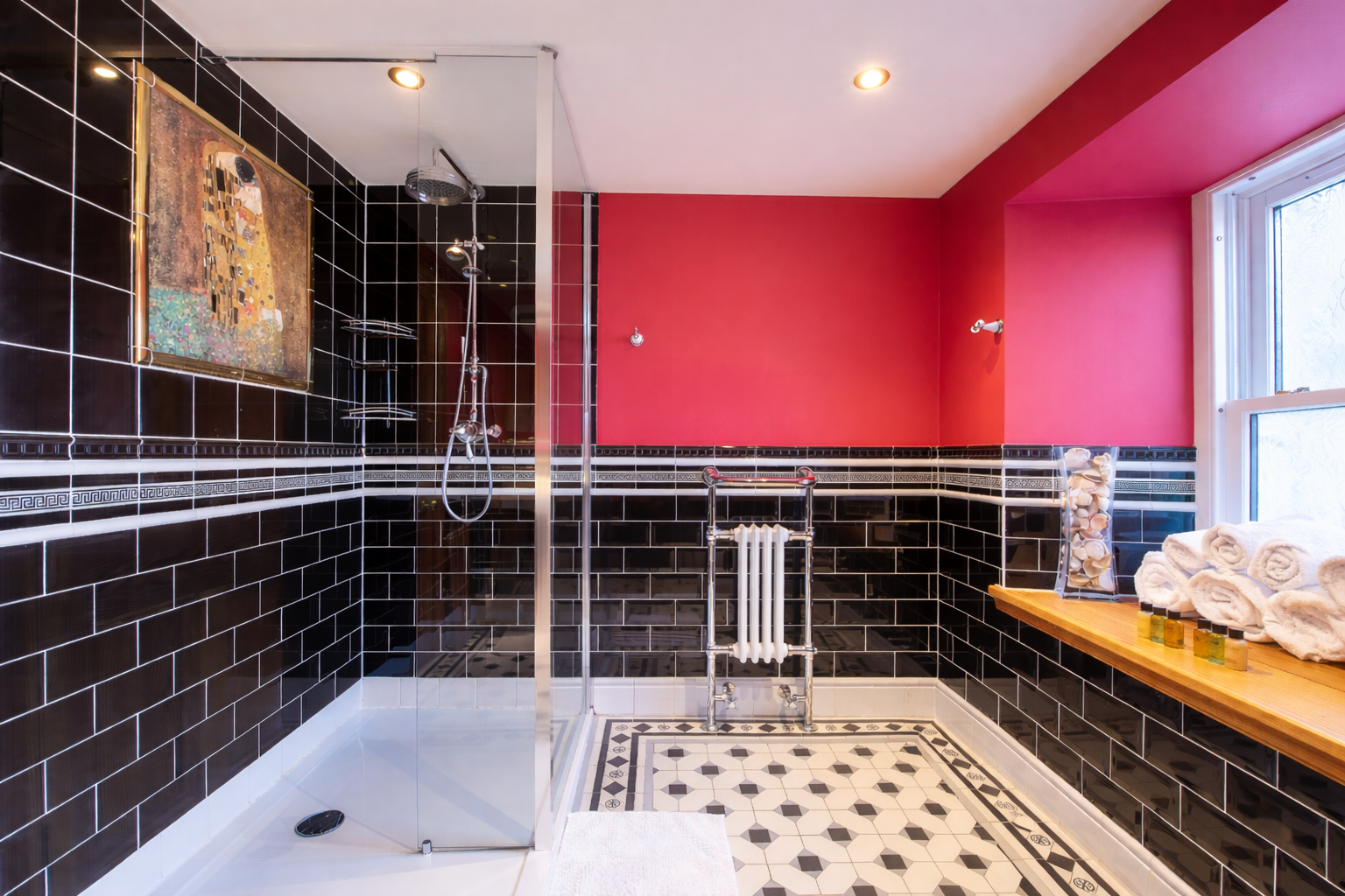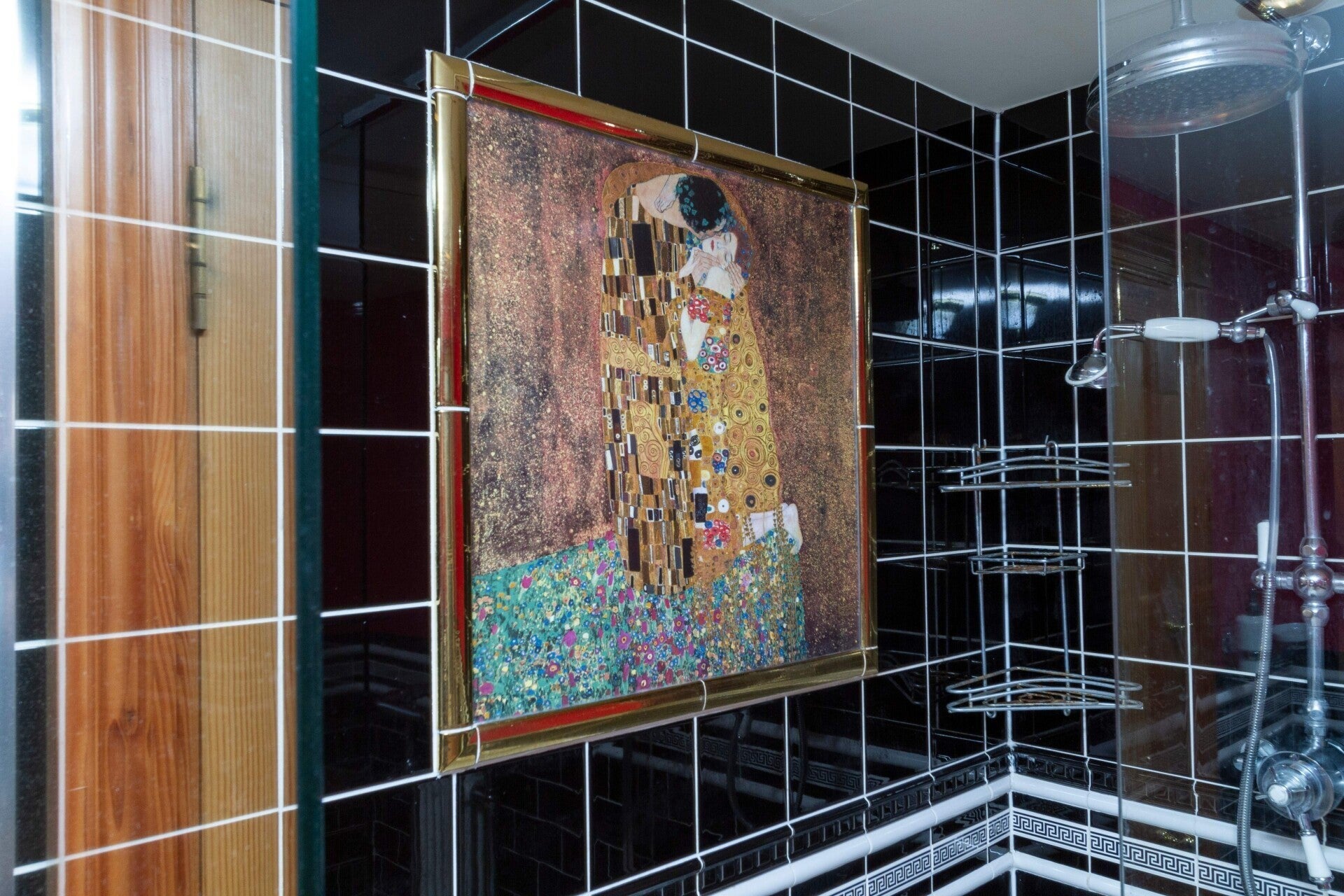 The walk‑in shower is finished with a striking Gustav Klimt “The Kiss” tile — a small artistic moment that elevates the room and adds a sense of personality and beauty.