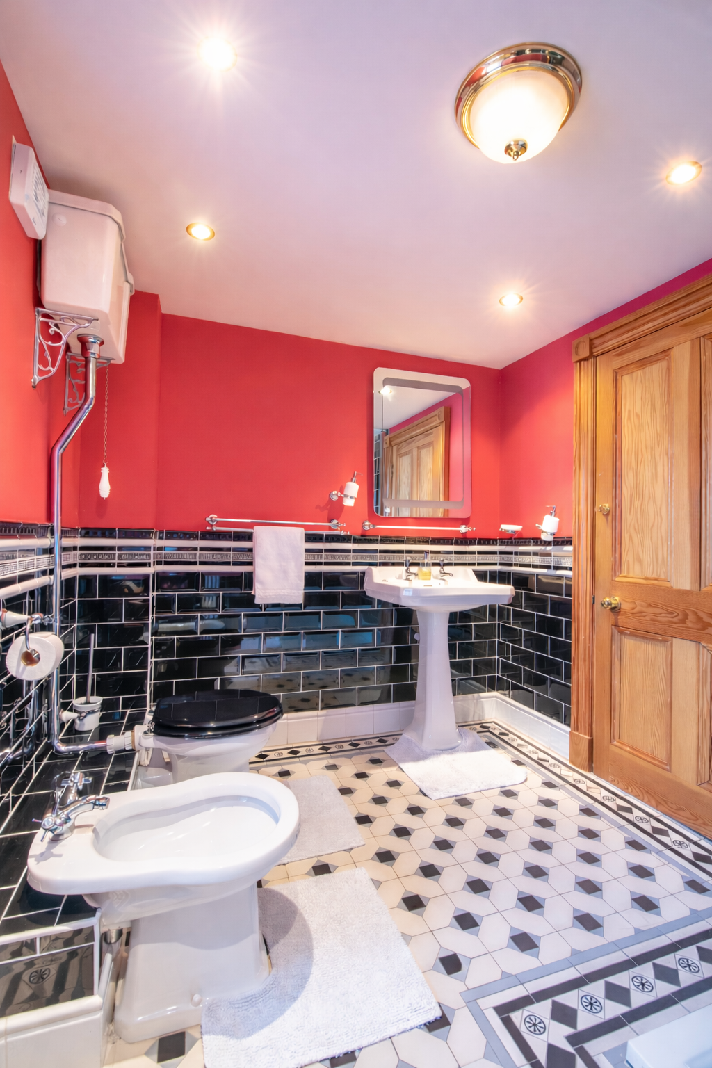 A bidet and walk‑in shower offer both convenience and comfort, especially for families with young children. The high cistern toilet adds a unique period touch, making the space feel distinctive and memorable.